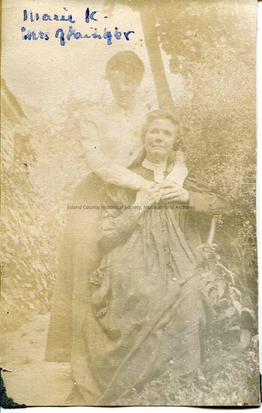 A faded black and white photo of two women outside. An older woman is sitting and a younger woman is standing behind her with her hands around the sitting woman's shoulders. The older of the two women is wearing a dress while the other woman is wearing a skirt and blouse. Behind the women is brush, trees and part of a building. The top left corner of the photo says, "Marie K., Mrs. Grainger". Marie Clarisse Kellogg with family friend Grainger.Made/Created