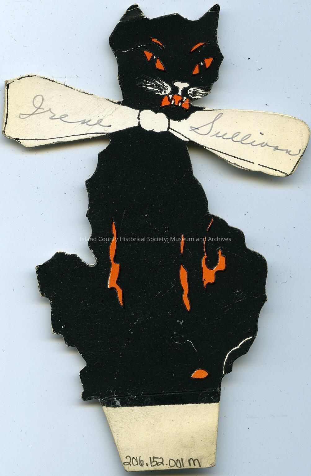 Cardboard shaped like a cat - black cat - sitting up with a wide bow with Irene Sullivan written on the sides. The cat is black with orange in the blank spaces as well as the eyes and mouth.
