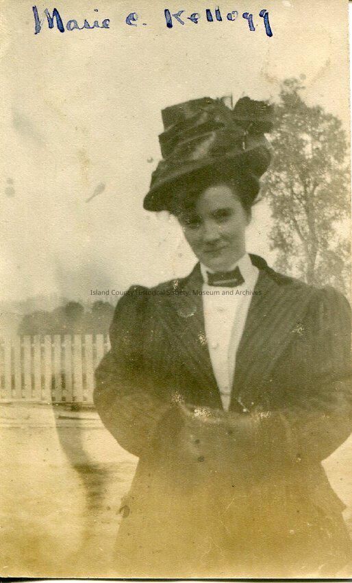 A black and white photo of a woman standing outside. The woman is wearing a dress, jacket and hat. There is a fence visible in the background. The top of the photo says, "Marie C. Kellogg".