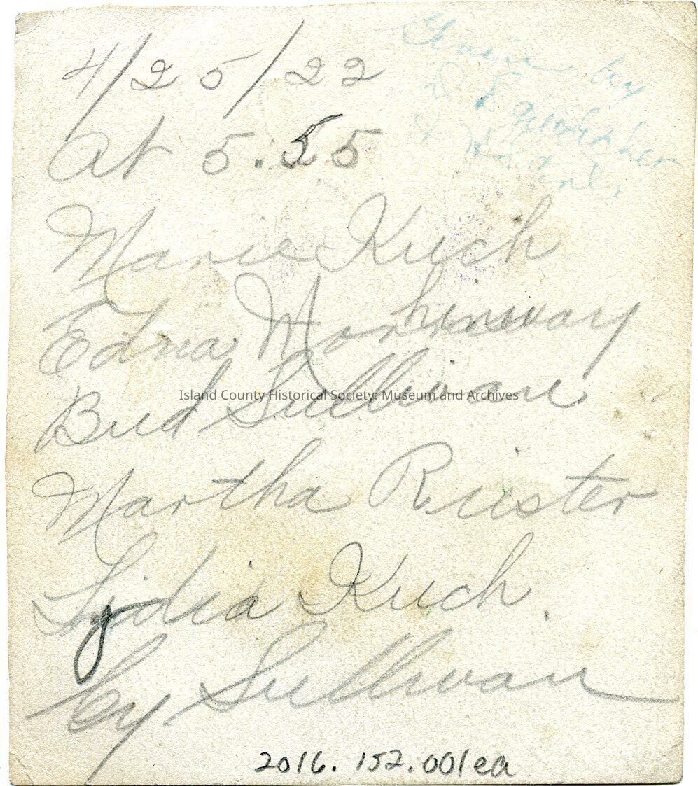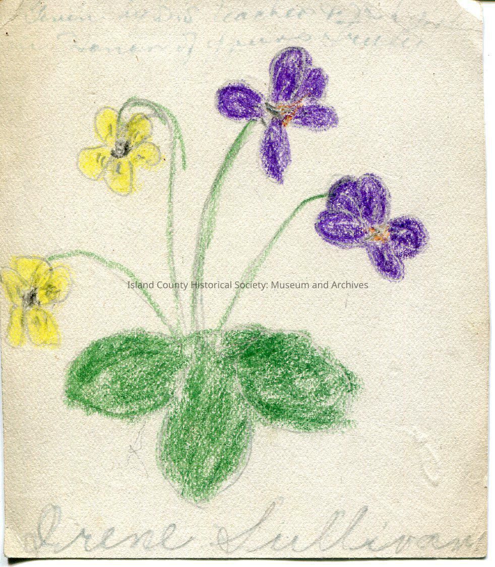 Manila hand-drawn card with pansies on the front and a note on the back. Written on the front is Irene Sullivan and other writing in blue. Dated 25 April 1922. List of names on the back: