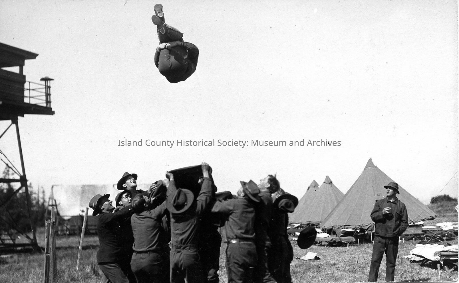 Group of soldiers in field. Group holds blanket while another flies into the air in blanket toss somersault. Tents in rear with sides up and cots outside. Observation tower on left. Postmark is Fort Flagler, Aug, 1914.