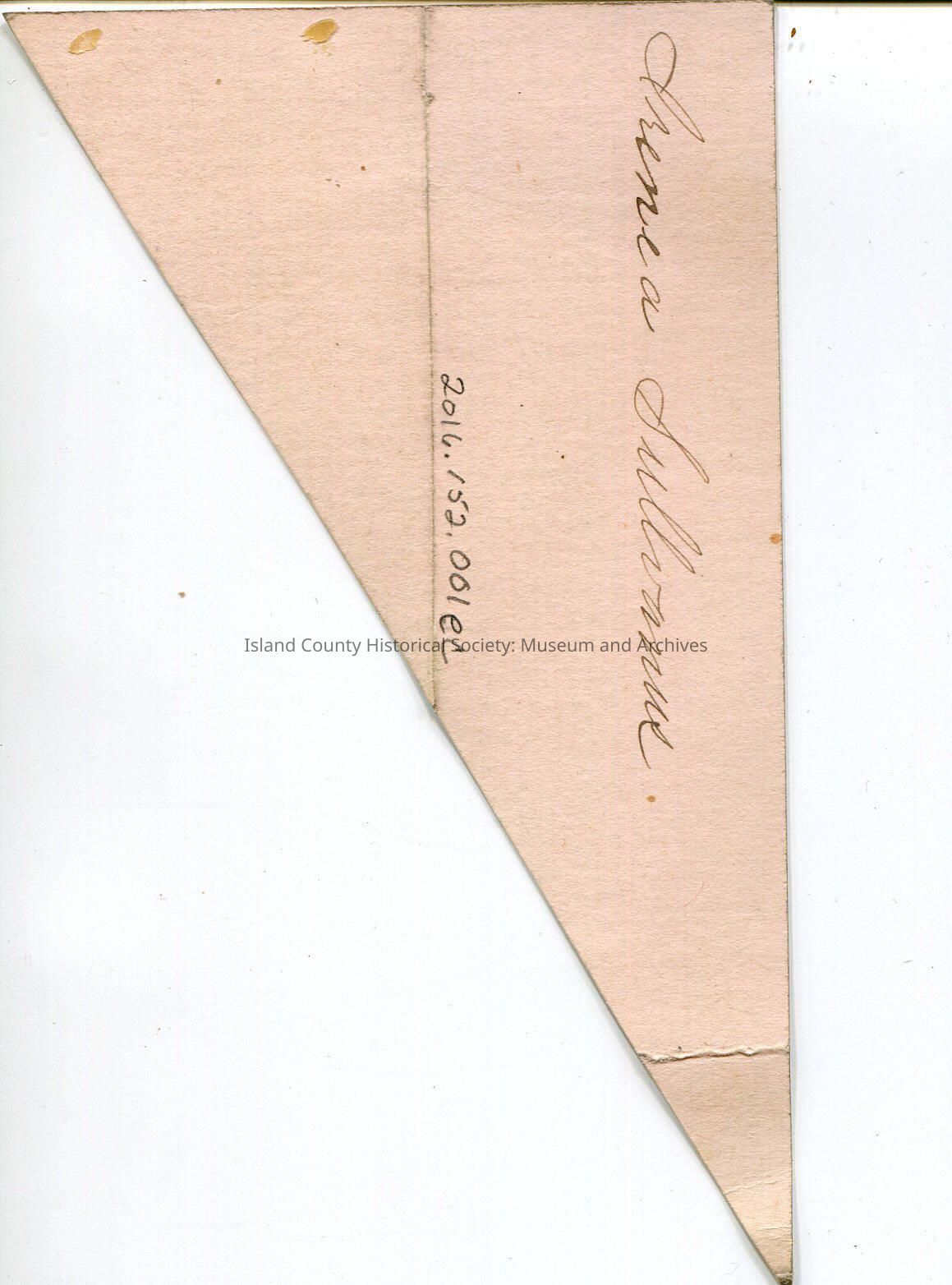 Pinkish traingular card with writing on the front and back. Written on the front is Irenea Sullivan. On the back: