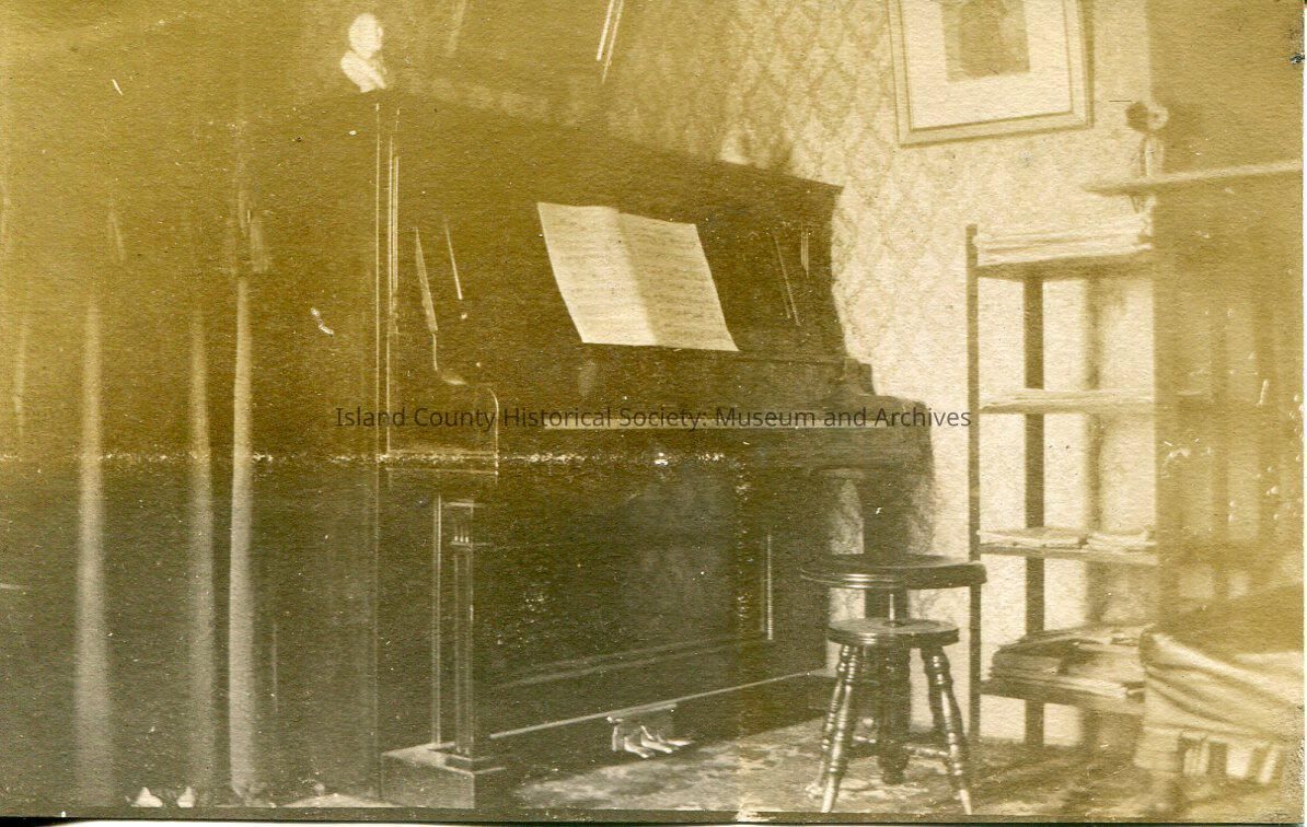 A black and white photo of a piano. There is sheet music on the piano and a stool in front of the piano. There are a couple shelves and pieces of framed art in the background.