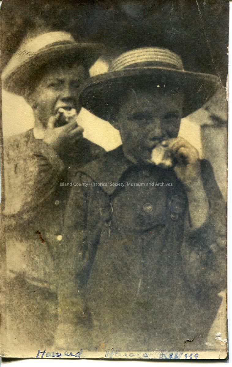A black and white photo of two boys with straw hats on eating apples. The boy in front is wearing overalls. The bottom of the photo says, "Howard, Harold Kellogg". The back of the photo says, "Harold + Howard eating apples. Taken by Geo Kellogg".