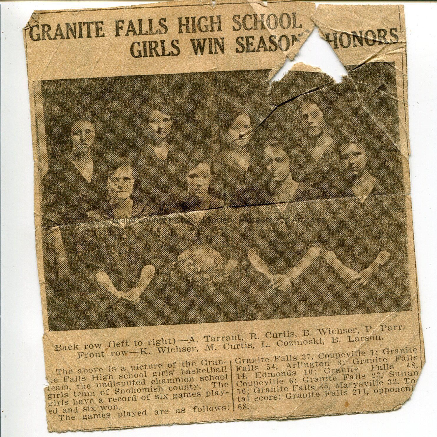 Newspaper clipping from Daily He... April 17, 1920. Granite Falls High School Girls Win Season Honors. Photo of 8 young women.