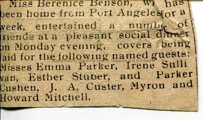 Newspaper clipping of notice of Miss Berenie Benson's dinner party. Guests: Emma Parker, Irene Sullivan, Esther Stuber, and Parker Cushen, J. A. Custer, Myron and Howard Mitchell.Lexicon