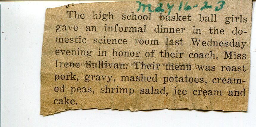 Newspaper clipping of a high school basket ball girls game. Coach was Irene Sullivan. Written in green ink at the top: May 16, 1923