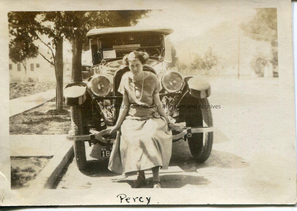 A black and white photo of a woman sitting on the front of a vehicle. She is wearing a dress and long necklace. The bottom of the photo says, "Percy". The back of the photo says, "guess who?".