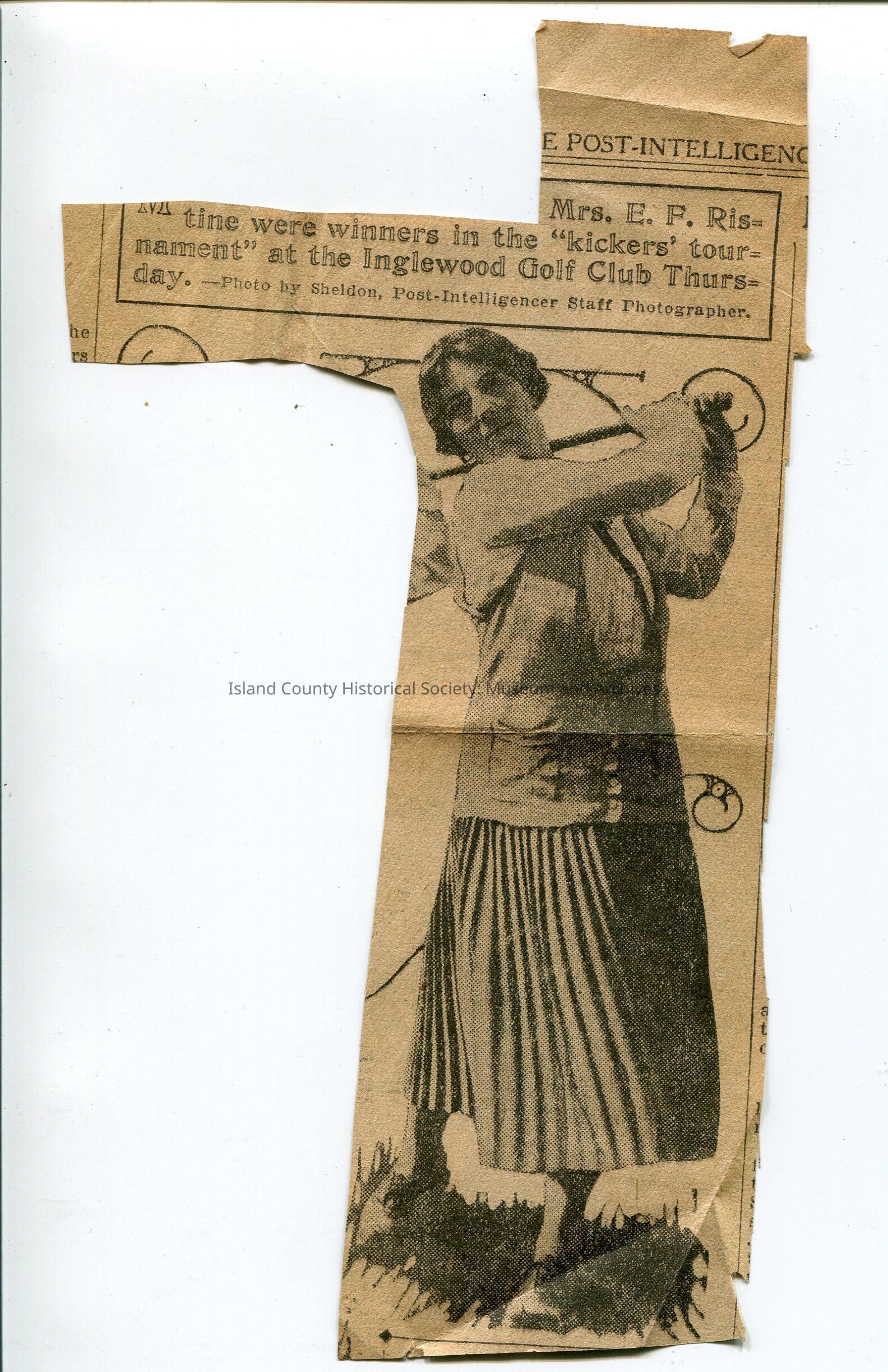 Newspaper clipping with a woman playing golf. Seattle Post-Intelligencer. No date. Caption: (cut off) Mrs. E. R. Ristine were winners in the "kickers' tournament" at the Inglewood Golf Cllub Thursday.