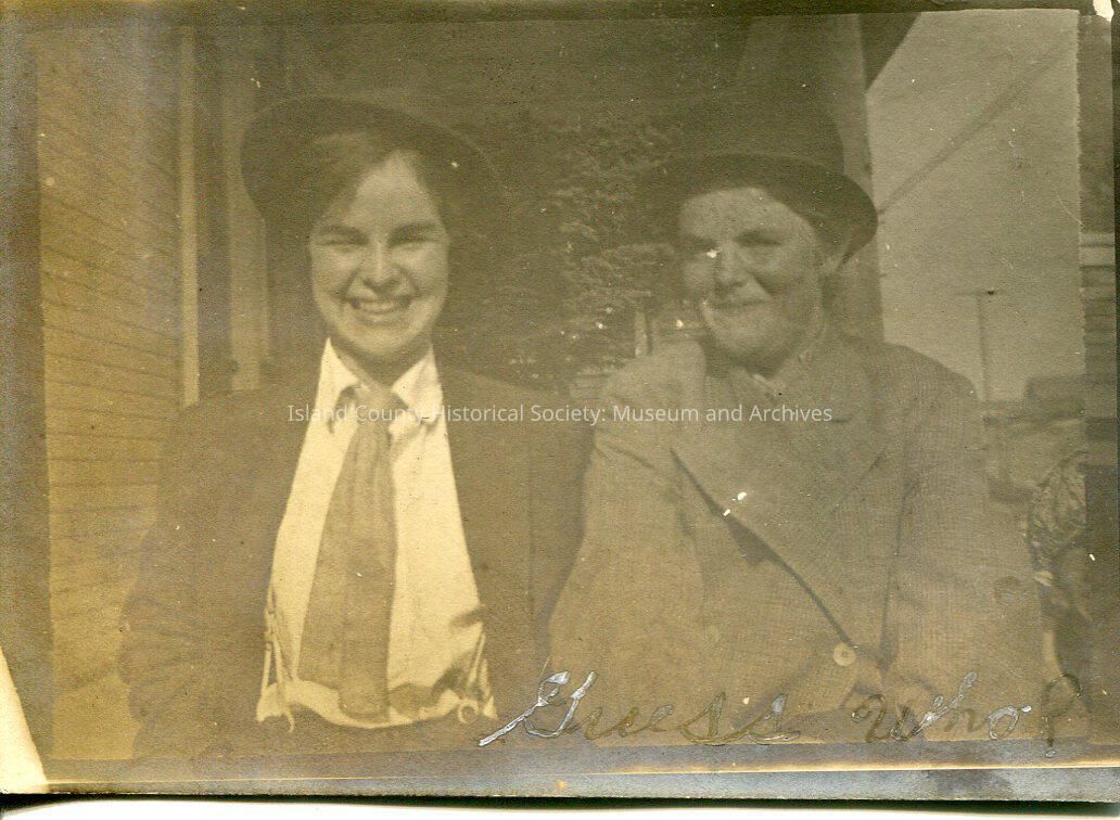 A black and white photo of two women. The woman on the left is wearing a hat, white shirt, tie, suspenders and suit jacket. She is smiling at the camera. The women on the left of the photo is wearing a hat and jacket. She is also smiling/smirking at the camera. The bottom of the photo says, "Guess who?". Avis Kellogg on the right.