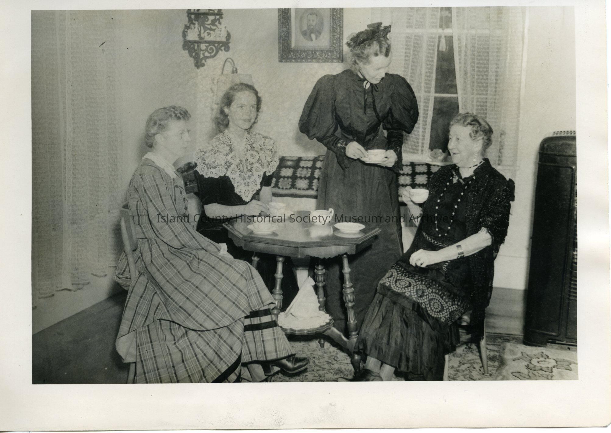 Photo of four women sitting at a table with teacups. Handwritten on the front is "Daughters of Pioneers (?)."