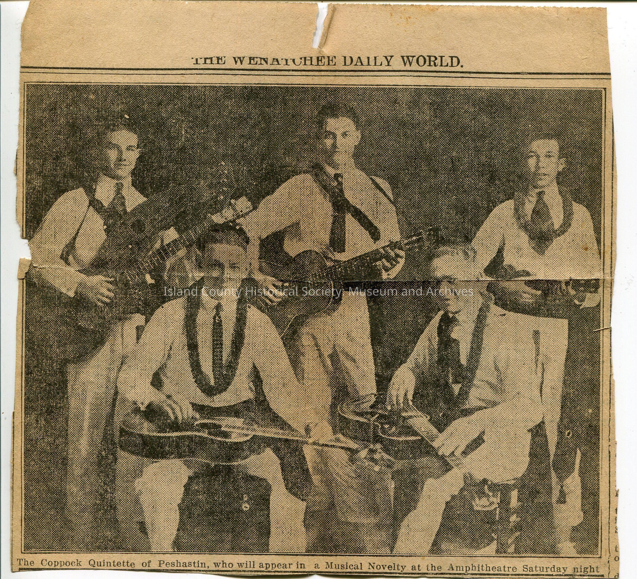Newspaper clipping from the Wenatchee Daily World. No date. Photo of five men in light shirts, trousers and leis. Playing guitars. Caption: The Coppock Quintette of Peshastin, who will appear in a Musical Novelty at the Amphitheatre Saturday night.