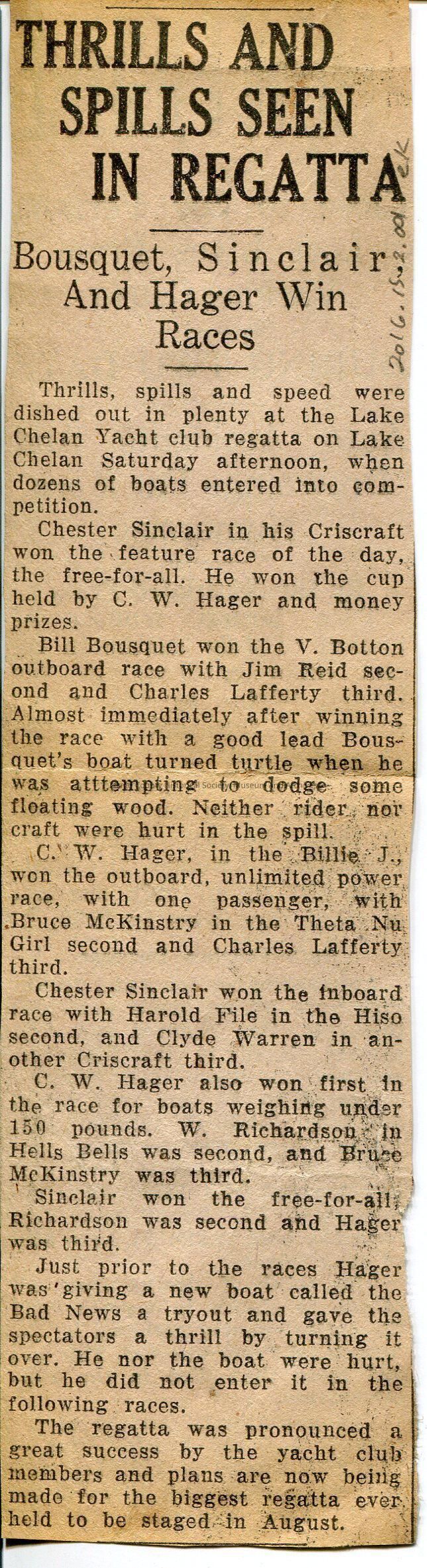Newspaper clipping. No date. "Thrills and Spills Seen in Regatta" Lake Chelan races.
