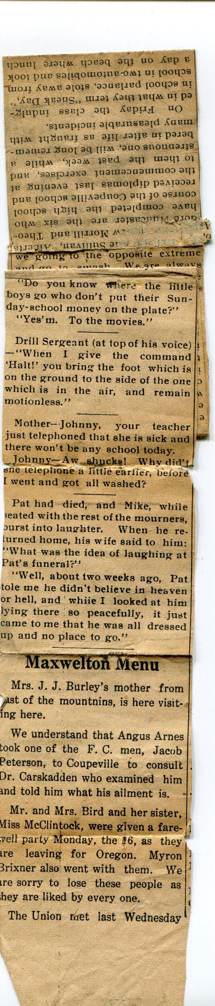 Newspaper clipping. No date. On the front: Nellie Benson, clerk of school board, I.O.O.F., Mr. F. A. LeSourd, Irene Sullivan. On the back: Maxwelton Menu. Stolen Smiles.Lexicon