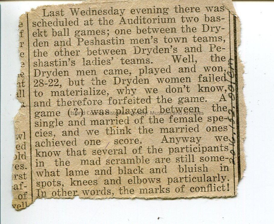 Newspaper clipping. No date. Two basketball games - Dryden and Pehastin men's teams and ladies teams.
