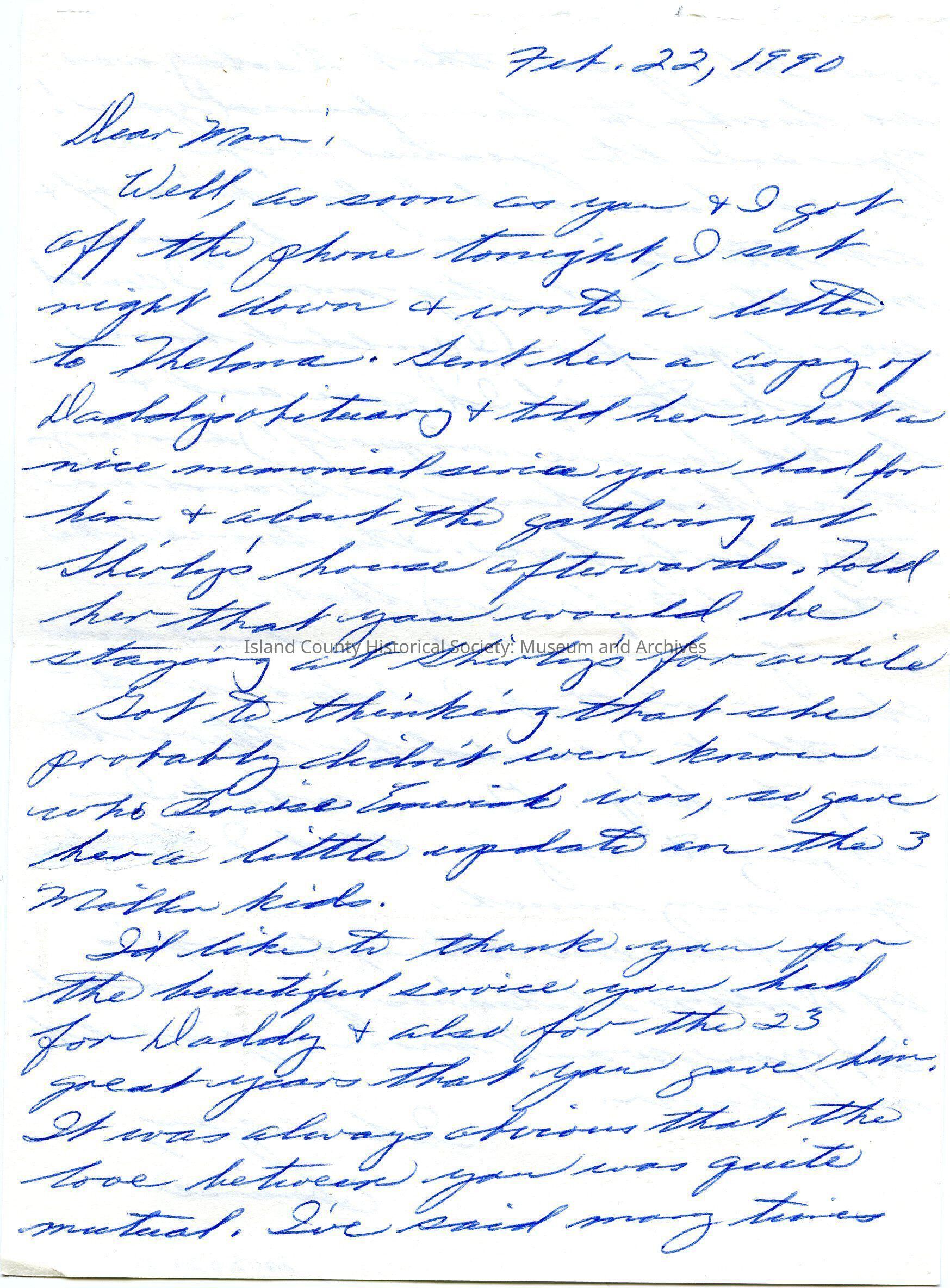 Letter from Louise to Mom, it is written in blue ink, in cursive. Dated February 22, 1990. Referenced Thelma.