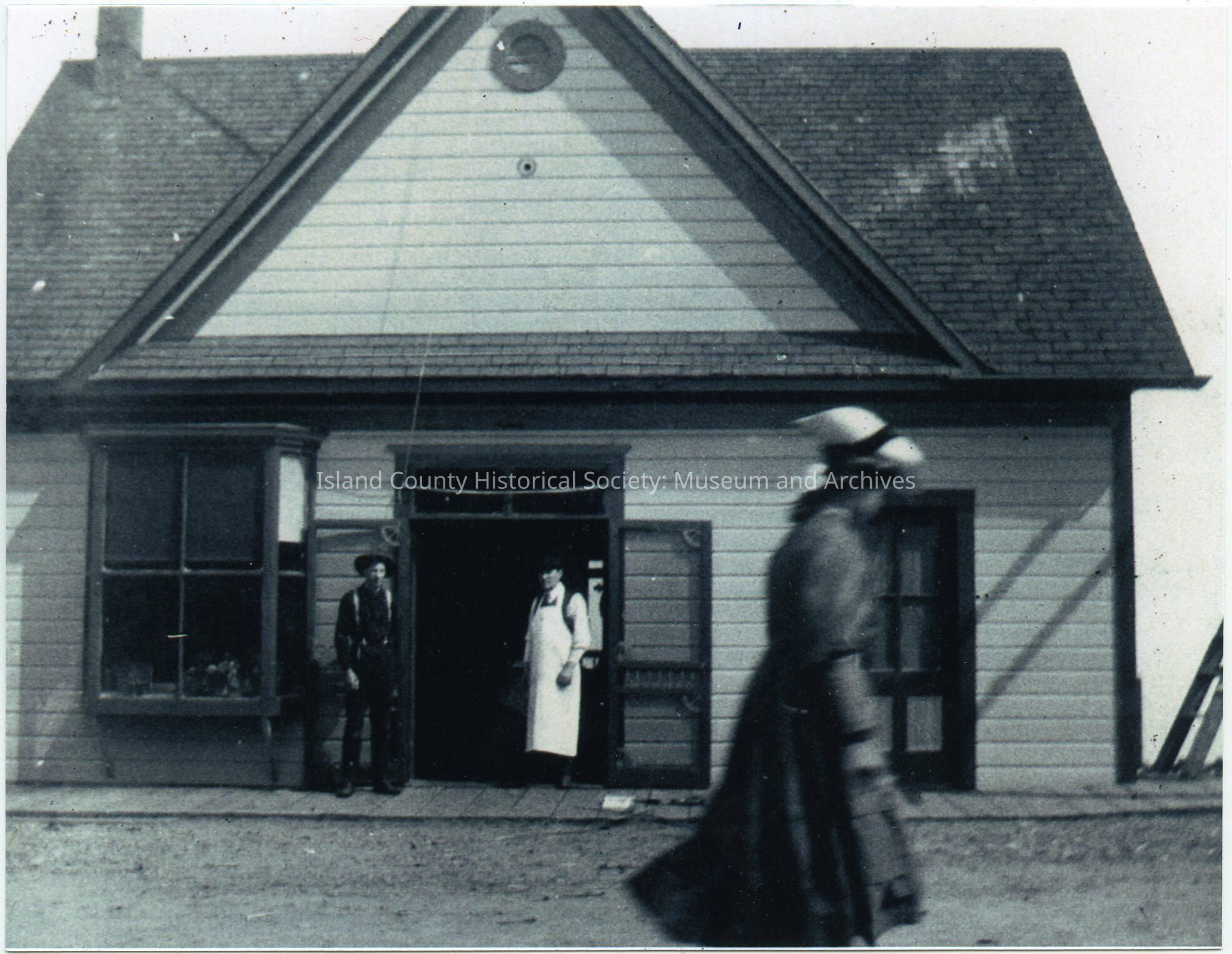 Photo of a building that had been at 24 NW Front Street. A person is walking (blurred) past two men in front of the meat market. The building has several peaked roofs, a round window at the top center, a bay window on the left, double doors with transom in the center and another door on the right. Wood sidewalk and dirt road. On the back: Coupeville, WA. Fall 1906 or Spring 1907. Fred Mayer in apron; Howard Libbey - other man. In front of their meat mkt. (market). Building now across Coveland from Autobarn and Post Office.