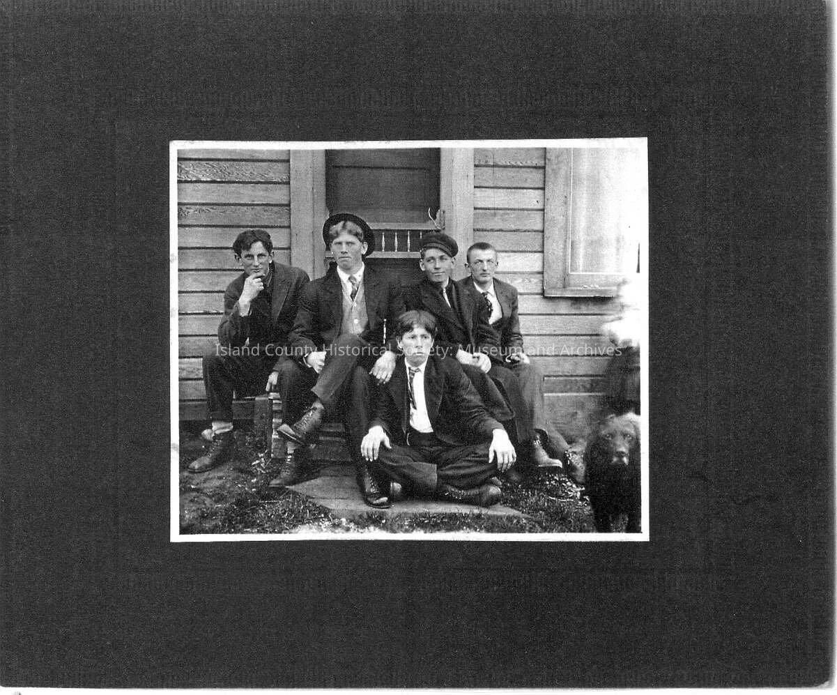 Black & white photocopy of five young men sitting on the stoop of a clapboard house. The five men from left to right are: Al Van Dam, Harvey Grasser (wide brimmed hat), Albert Van Lint (sitting cross-legged), John Van Dam (cap), and Bill Van Waeringen. All the men are wearing dark pants, jackets and ties. The picture is framed in a black border. No date.