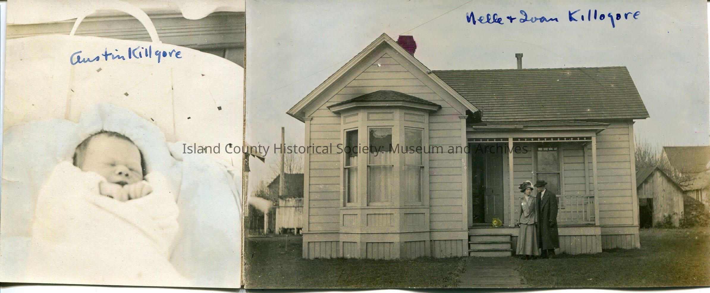 Two photos taped or glued together. The photo on the left is of a baby wrapped in a blanket. The top of that photo says, "Austin Killgore". The photo on the left is a postcard of a couple standing in front of a house. The couple is looking at each other. The woman is wearing a dress and had and the man is wearing a suit, jacket and hat. There is a cat on the porch next to them. The top of that photo says, "Nelle + Ivan Killogore".Made/Created