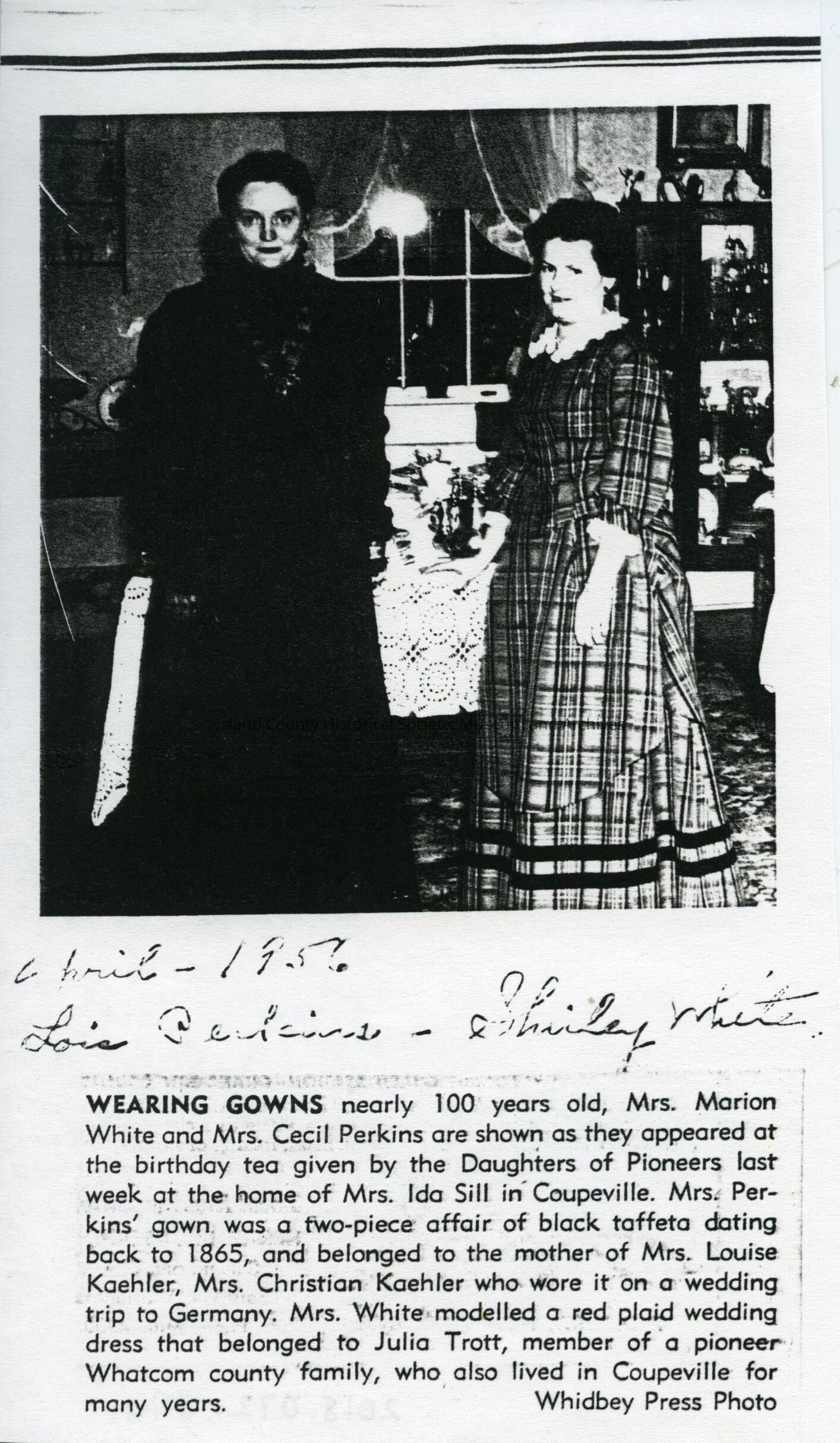 Photo of two women. Handwritten on front is "April 1956, Lois Perkins (?) - Shirley White (?)." Typed below is a description.