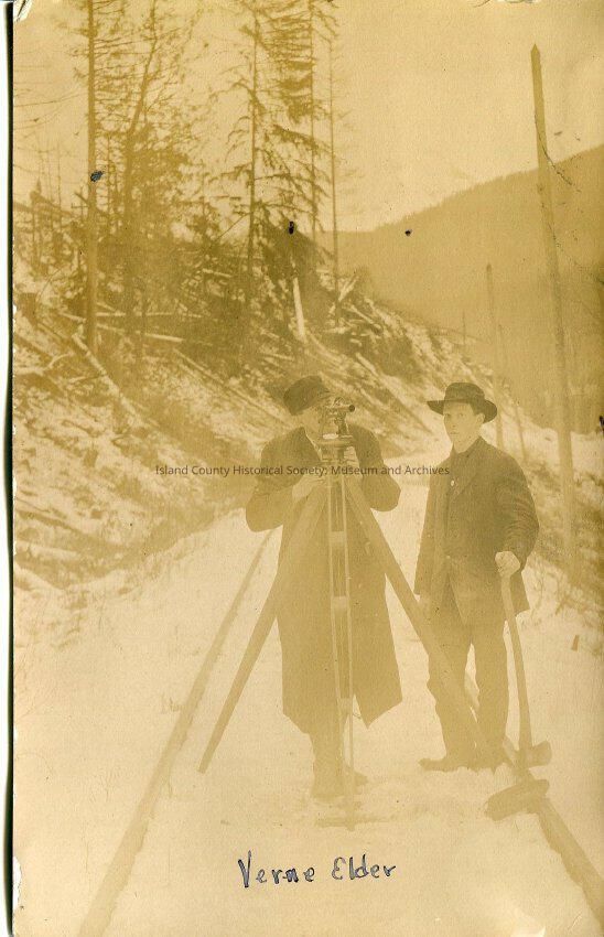 A black and white postcard of two men standing on railroad tracks with a tripod and surveying equitment set up. There are a few inches of snow on the ground. The men are wearing suits and hats. One of them has a coat on as well. The man on the right has an axe in his hand. The bottom of the photo says, "Verne Elder". There is writing on the back of the postcard. Anna Bancroft Kellogg's husband. Went by Verner, but George Verner Elder. He worked as an engineer for the City of Anacortes. 1910 Bellingham census shows he was a railroad engineer.