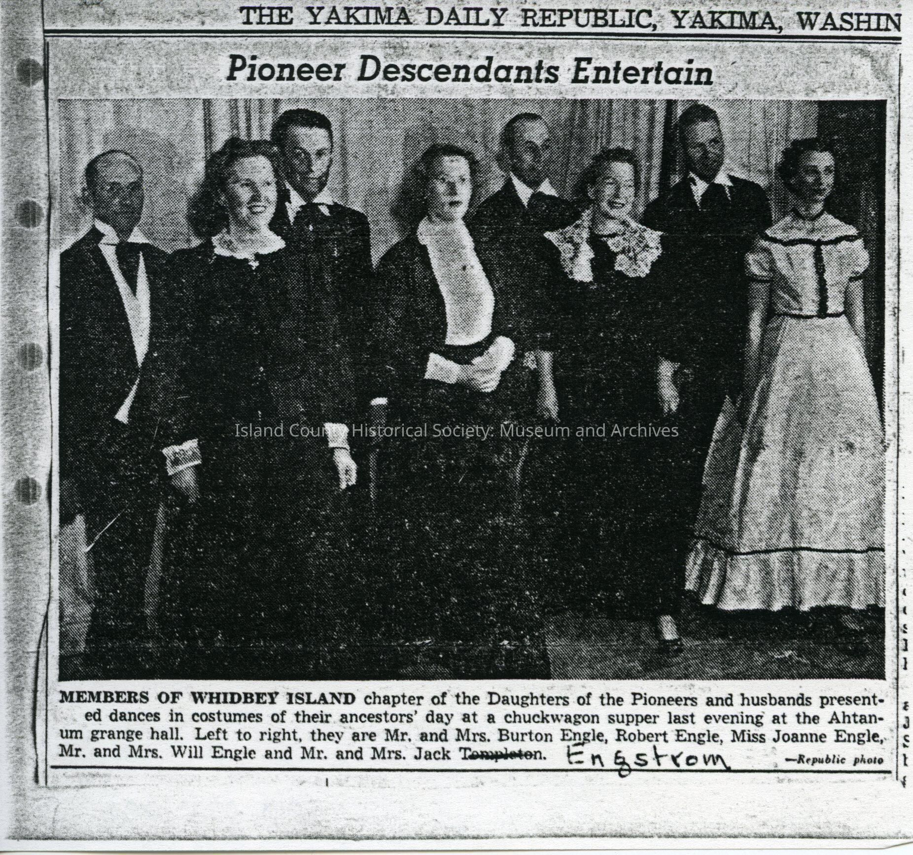 Photo of four couples standing together. Typed above is "The Yakima Daily Republic, Yakima, Washinton. Pioneer Descendants Entertain." Typed below is a discription.