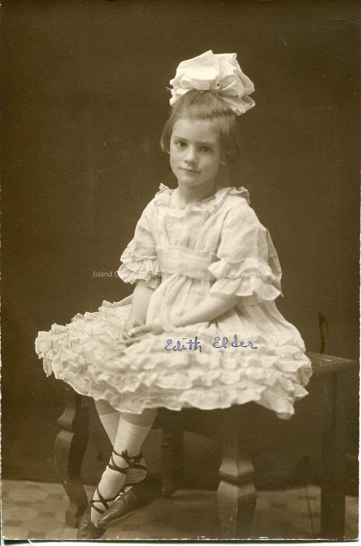 This black and white photo features Edith Elder in a white dress, with white knee socks with black ballet shoes. Edith's hair is tightly pulled back under a white hat. Edith Dillon Elder was born 1913.