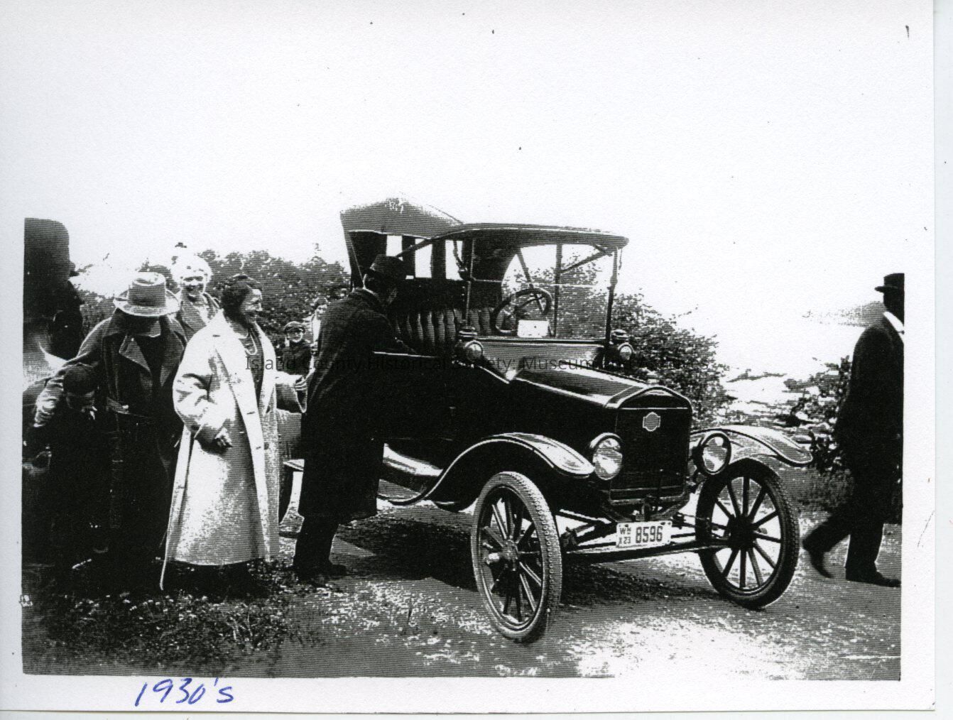 Photo of several people standing next to a old car. Hhandwritten on the bottom is "1930's."