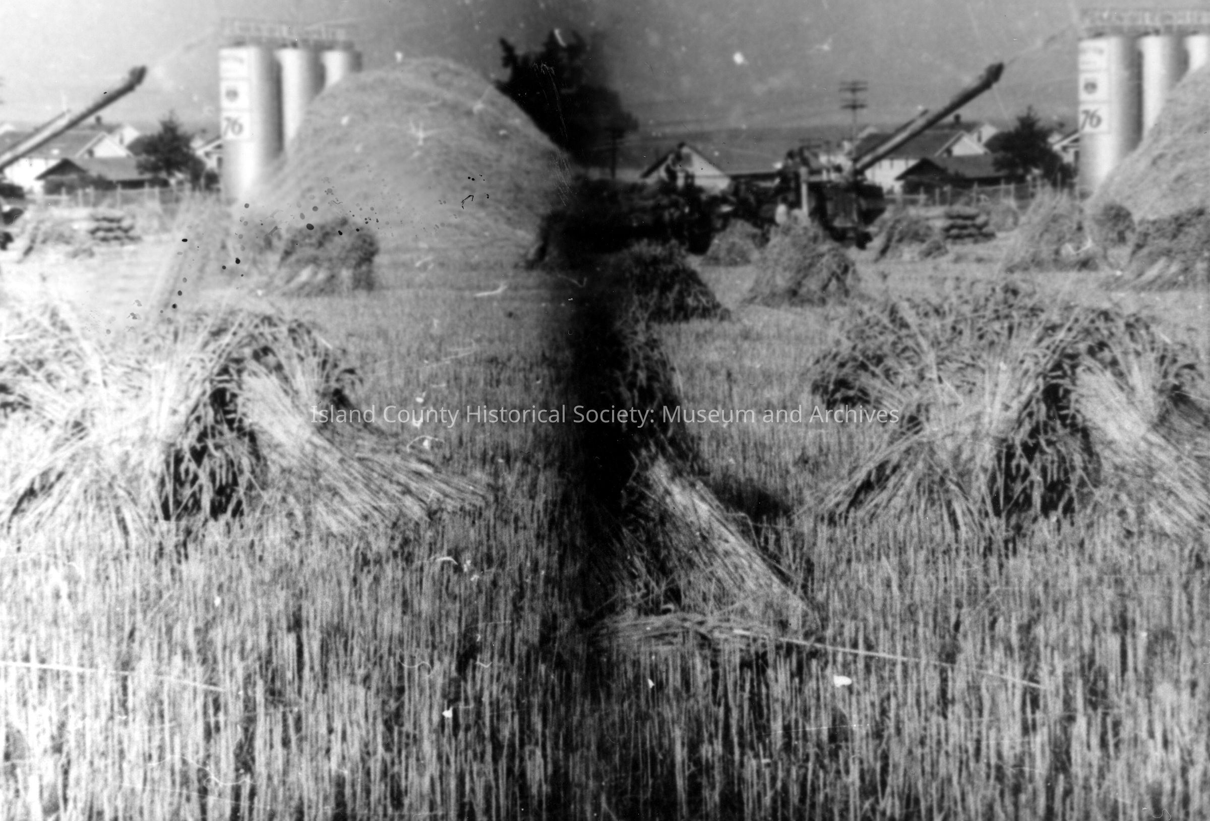 Photo with negative (AT 457B): Stereopticon photo and negative. Harvest time: Whidbey Island farm scene, Krueger farm. Haystacks in front of oil tanks.
