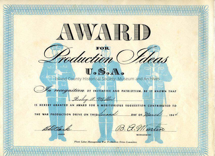 Certificate of Merit for Wesley A. Miller for Production Ideas. From the Plant Labor Management War Production Drive Committee. Issued March 2, 1944.
