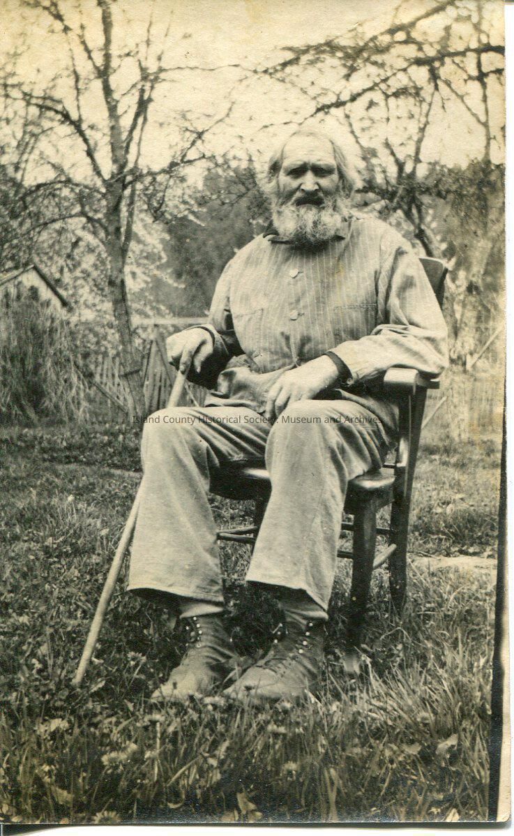A black and white photo of a man sitting on a wooden chair outside. The man has a white beard, a cane, and is wearing a striped shirt. The back of the photo says, "Grandpa Grainger, died at 99 years".Made/Created
