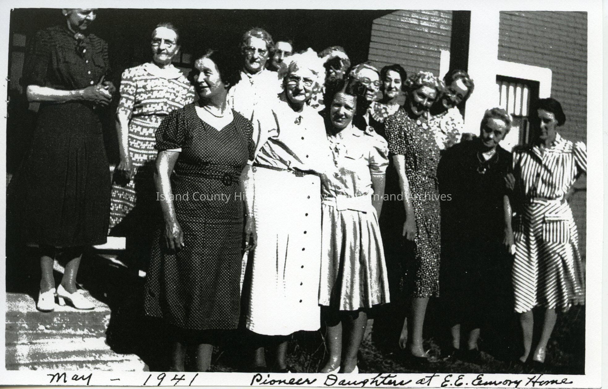 Photo of a large group of women standing on steps of a building. Handwritten below is "May - 1941. Pioneer Daughters at E.E. Emory (?) Home."