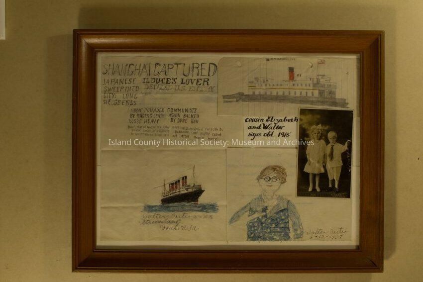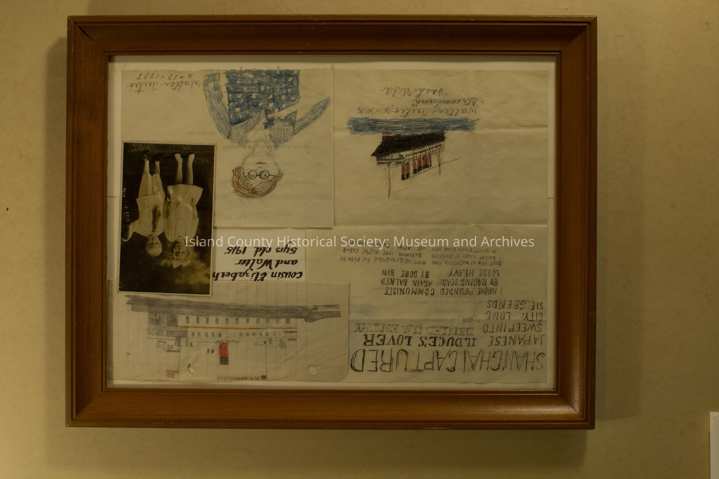 Framed "poster". White rectangular card with three slips of paper and a black and white photograph attached to it. Upper right: lined paper with M.S. Bainbridge drawing. Lower right: photo of girl and boy in studio, label at side: "Cousin Elizabeth and Walter 5 yrs old 1915". Upper left: A4 paper (stationary letter?) titled "Shanghai Captured", drawing of ship below and "Walter Autio Greenbank Wash. USA" scrawled beneath. Lower center: Sketch of lady with brown hair, glasses and blue dress, signed Walter Autio (on back of letter?). Approx 18"x14" incl. frame (simply decorated, varnished/painted wood).Lexicon