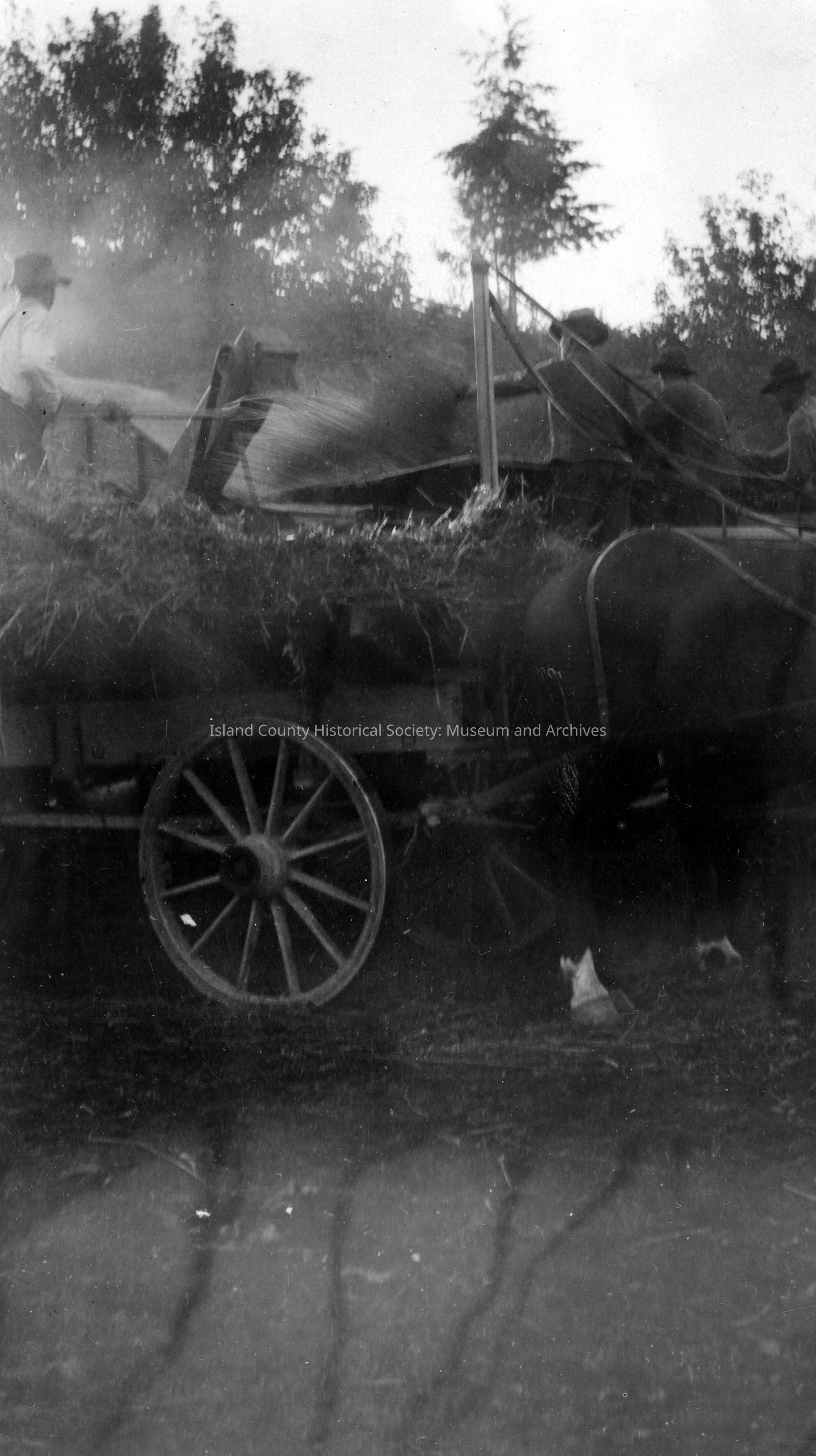 Hay wagon and farm equipment. Unknown men.