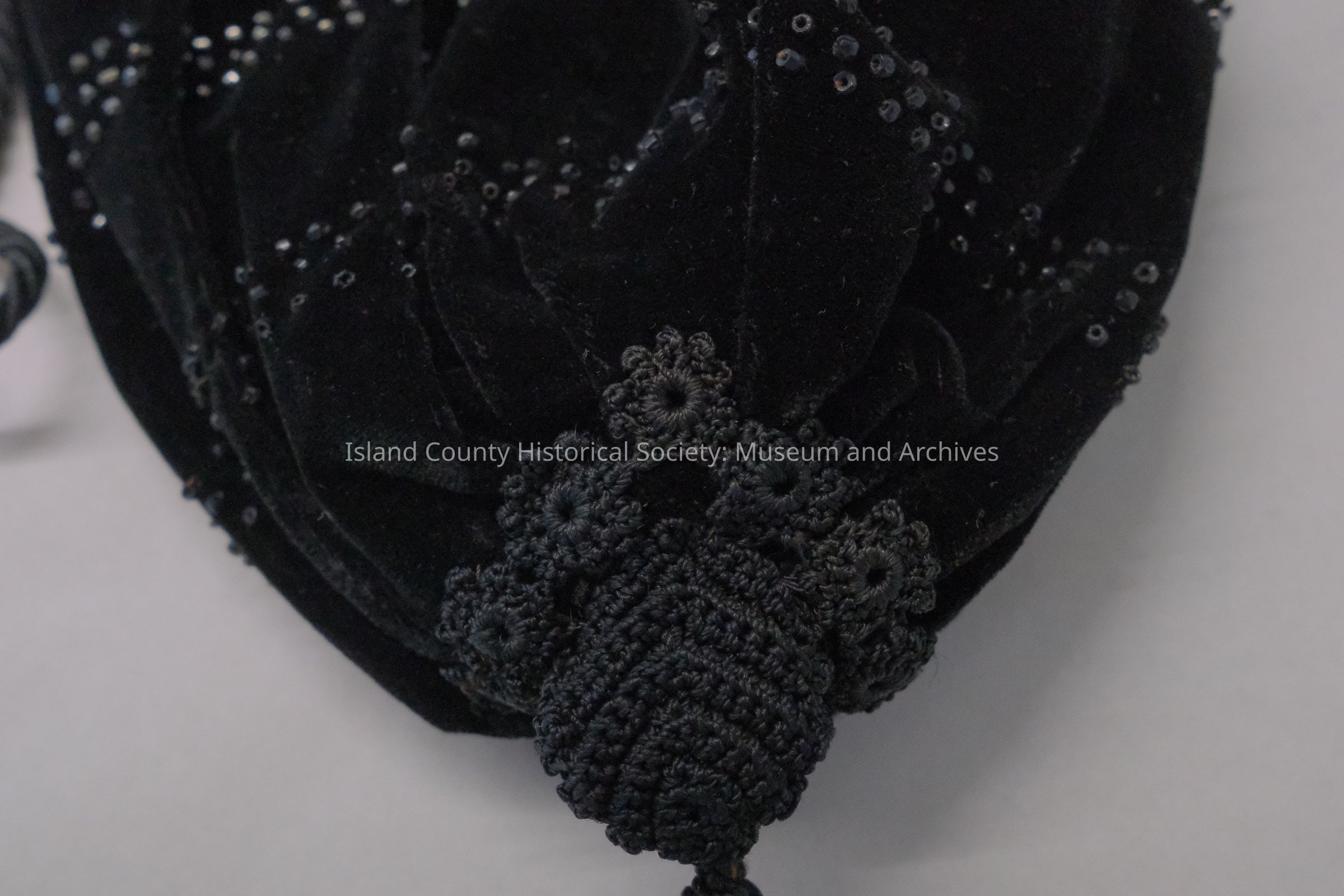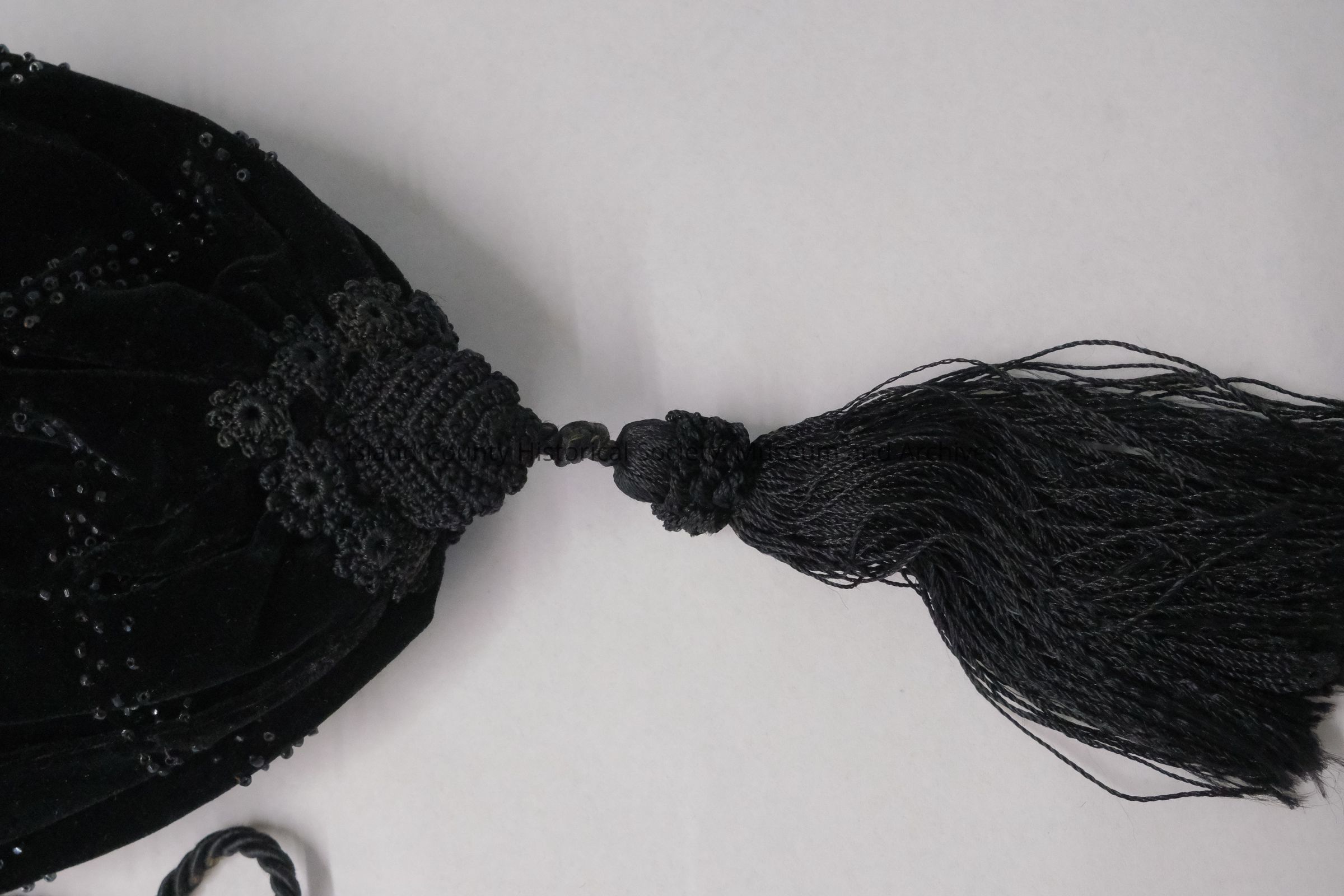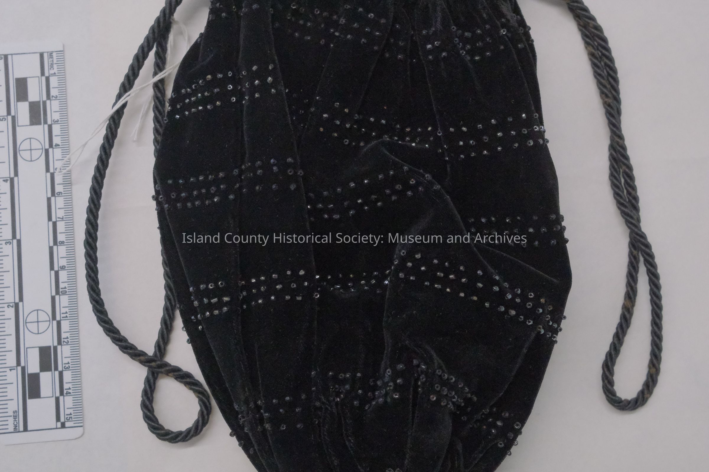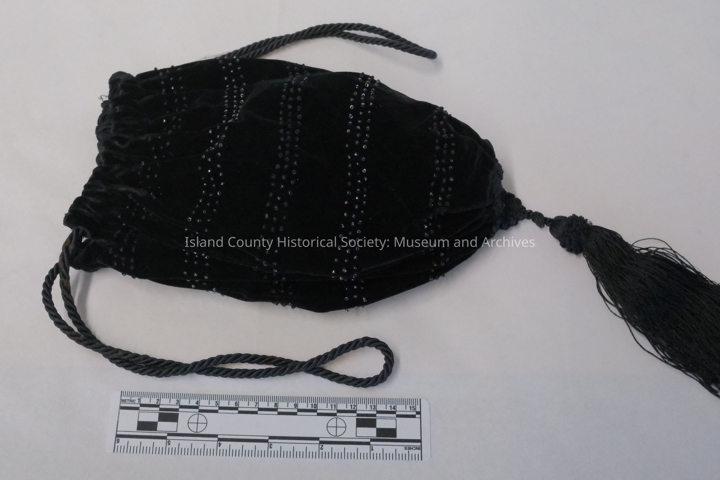 Early 20th c. drawstring purse. Composed of a black velvet outer and a black satin inner lining. Rows of black beaded sequins around the circumference of the bag. Corded drawstring reticule closure and tasseled bottom.Clothing/Dress/Costume Details