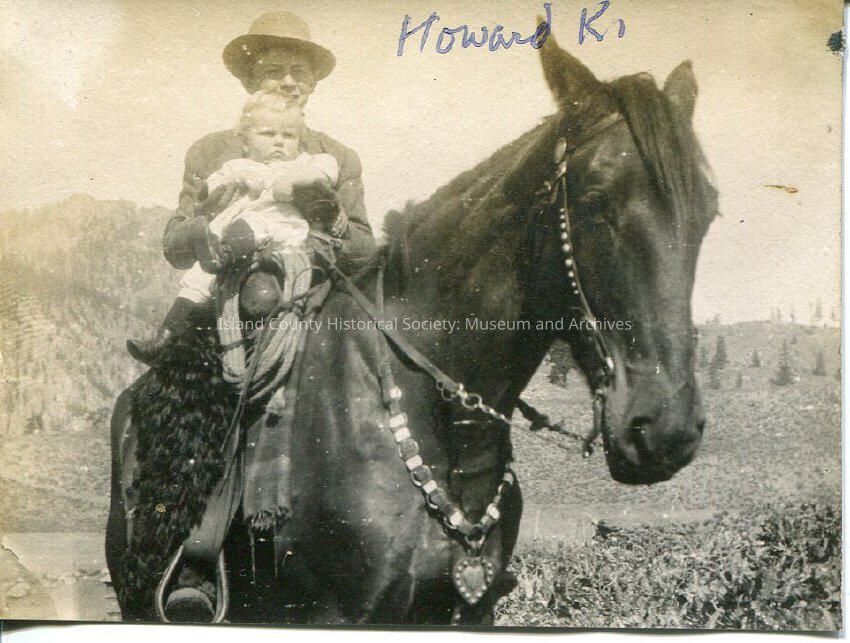 A black and white photo of a man sitting on a horse holding a baby. The man is wearing a hat and the baby is wearing all white and black shoes. The top of the photo says, "Howard K.". Patricia (Patsy) Kellogg is in is lap.