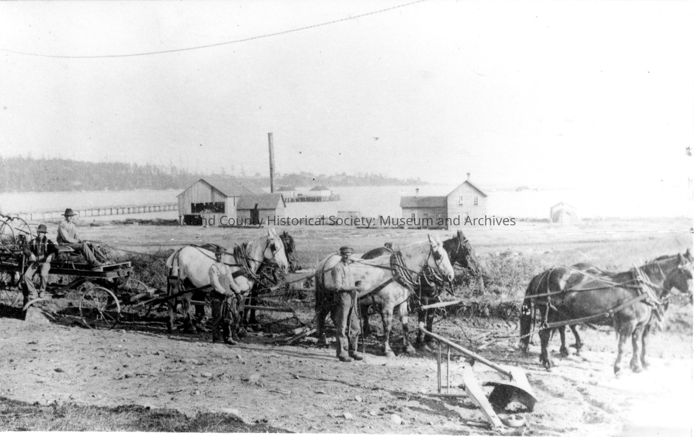 photo with negative: A six-horse team works on the east end of Oak Harbor Main St., Holman mill and house in background. near dock.