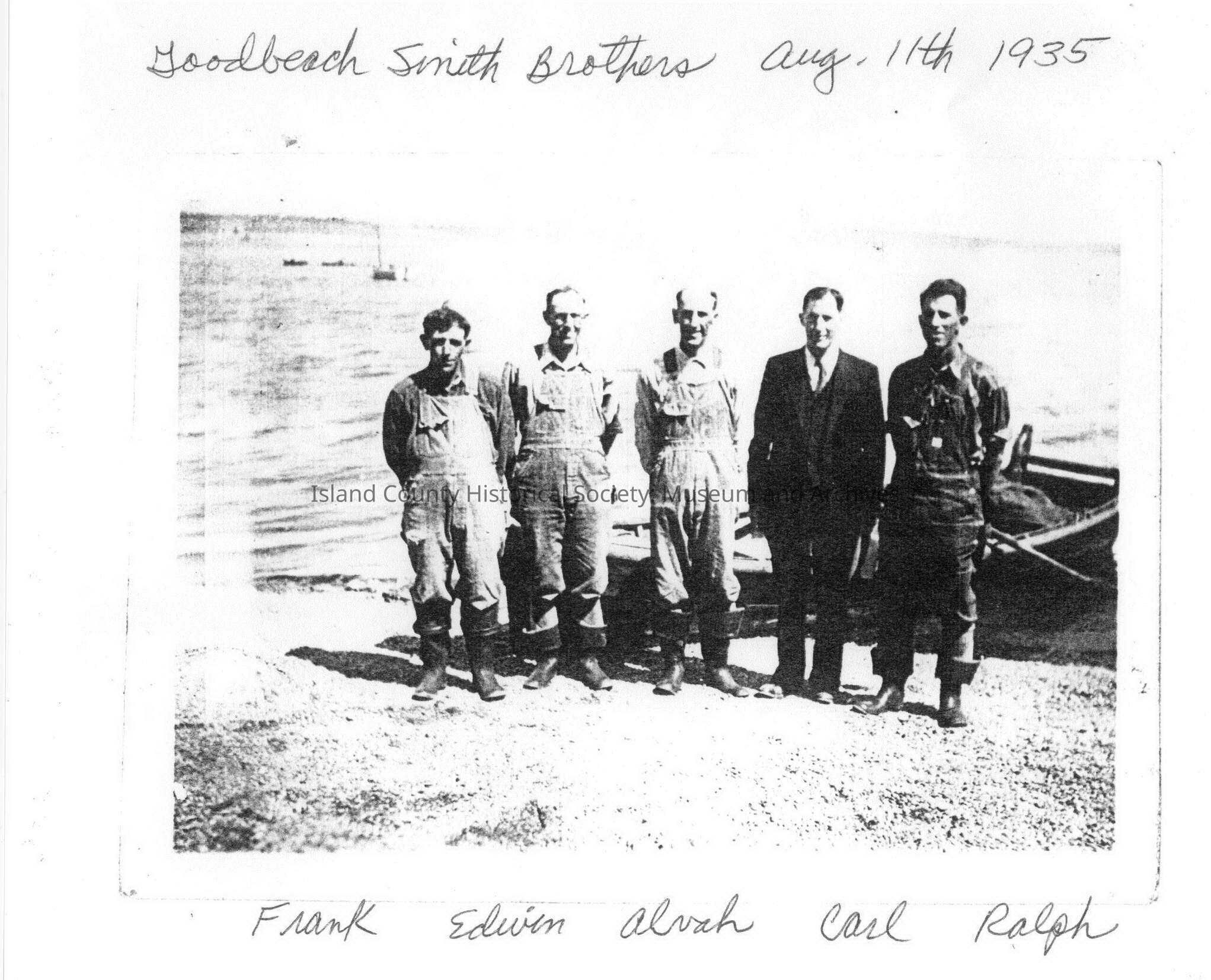 A photo of five men standing outside. Handwritten on the front is "Goodbeach Smith Brothers, Aug. 11th, 1935. L-R Frank, Edwin, Alvah, Carl & Ralph."