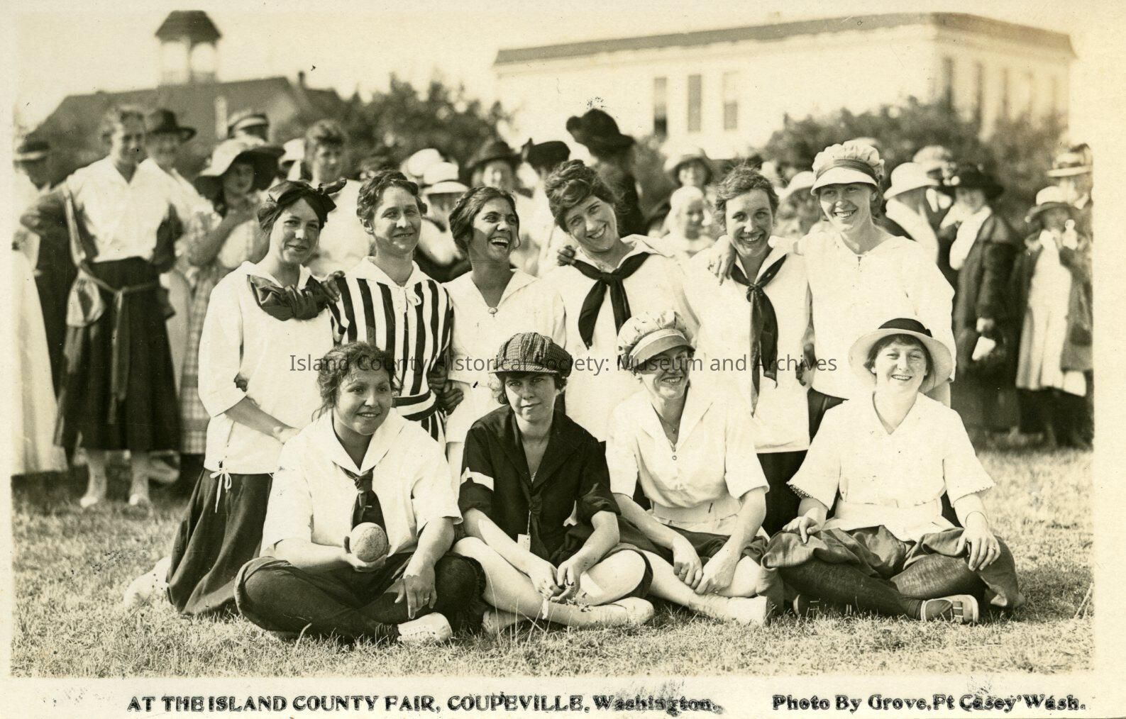 Photo of many women smiling, some sitting down, some kneeling, others standing, outside.Typed on the front is "At the Island County Fair, Coupeville, Washington. Photo by Grove, Pt Casey, Wash.Made/Created