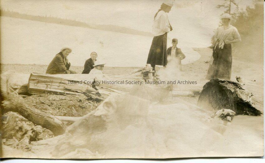 A black and white photo of a group of women at the beach. They are all wearing hats, skirts and blouses. Three of the women are sitting in the sand and the other three women are standing, starting to get ready to swim. There is a bunch of driftwood in the foreground. There is also a water mark in the foreground of the photo. The back of the photo says, "Taken at Lummi Isle on our senior picnic. Getting ready to go in swimming".Made/Created