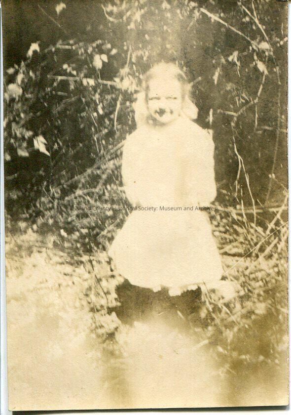 A black and white photo of a young girl smiling at the camera. She is wearing a white dress and the background is bushes. The photo is faded/blurry.