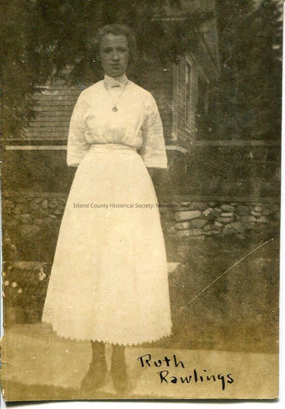 A black and white photo of a woman standing outside. She is wearing an all-white dress and has a necklace on. There is a stone fence and a house in the background. The bottom of the photo says, "Ruth Rawlings".