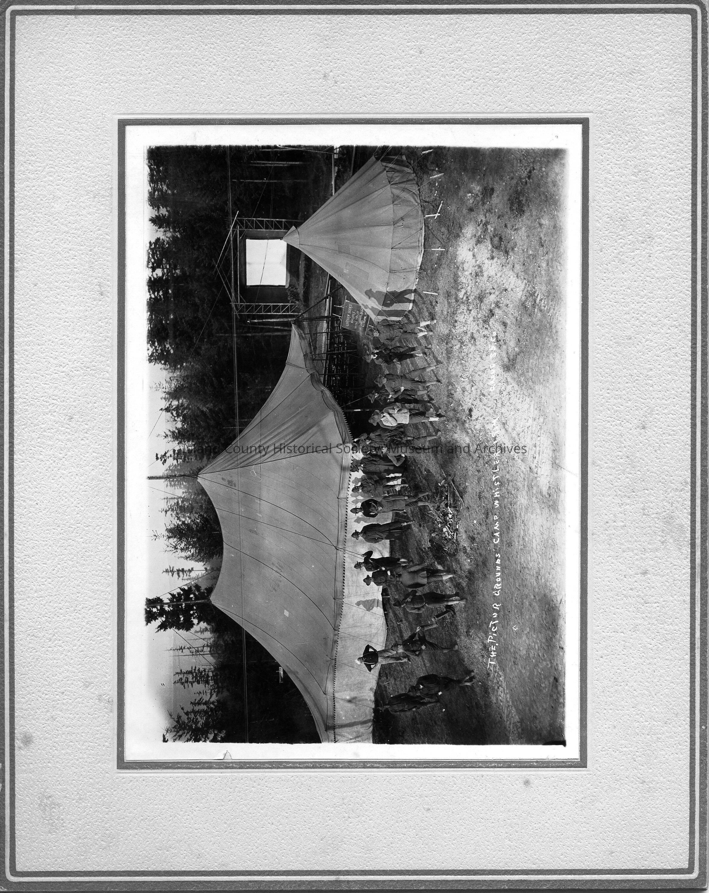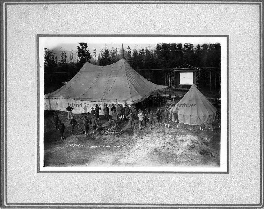 Large rectangular tent open on right side to reveal rows of chairs facing outdoor screen. Round tent to right has sign that reads: "Library books available. Writing tablets. Current magazines. Games." Soldiers mill about in foreground. Caption reads "The Pictur Grounds. Camp Whistler. 1914."