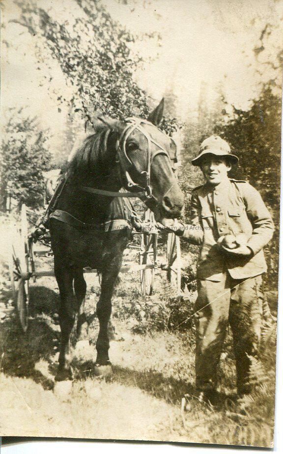 A black and white photo of a young man in a uniform feeding a horse apples. The man is smiling at the camera and the horse is taking an apple out of his hand. The horse also has a carriage attached to/behind it.