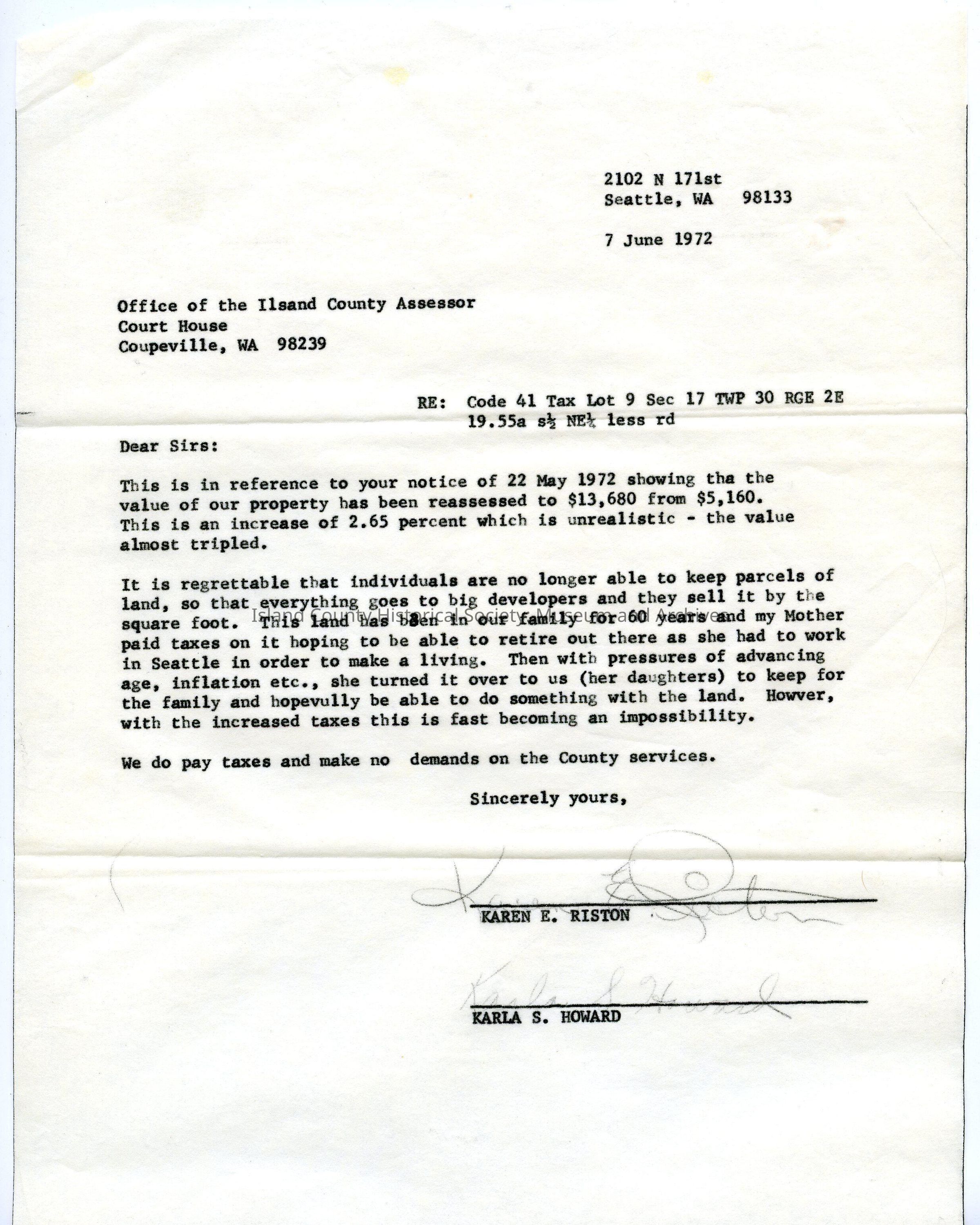Typed letter from Ms Riston and Howard to Island County Assessor stating unreasonable valuation of property, importance of the property and tax payments. Identical to 2017.028.014c