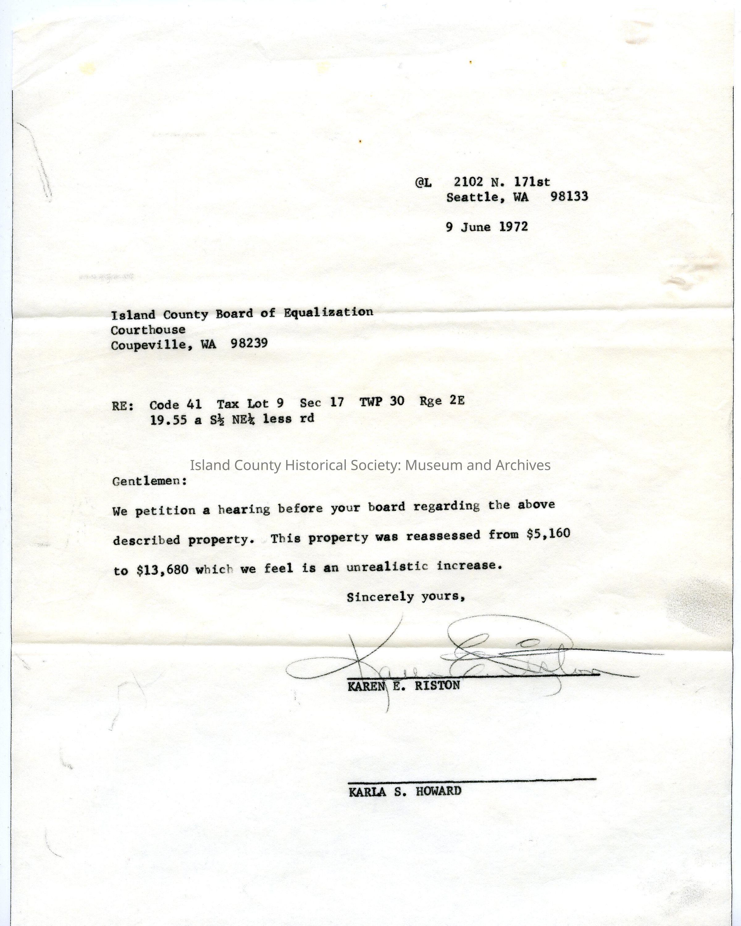 Typed letter from Ms Riston to Island County Board of Equalization asking to appeal property valuation.