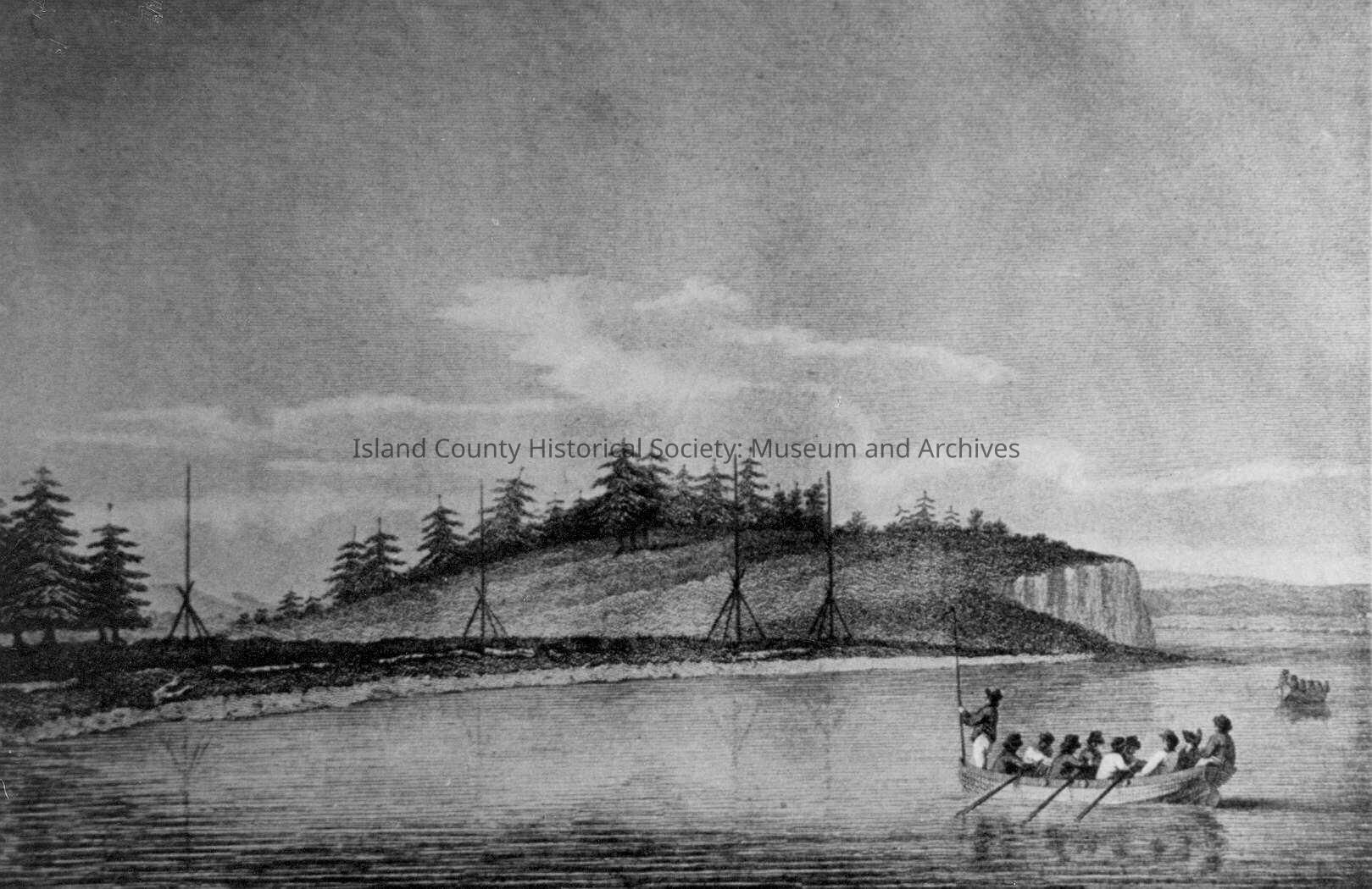 Mounted on photo display white board. Canoe filled with Indigenous Peoples--three sets of oars.