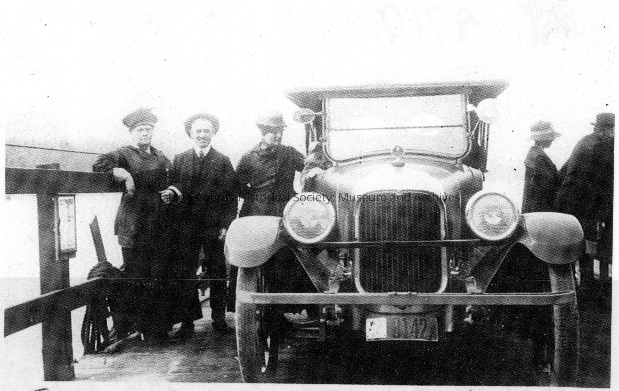 Photo printed on plain paper: Car on Deception Pass Ferry - Cornet Bay to "Blout's Bazaar" Left to right: Julia K. Hancock, Arthur Page, Mrs. Powell. Comment" "I think the car may be a 1916 but I'm not sure. L.D.H."