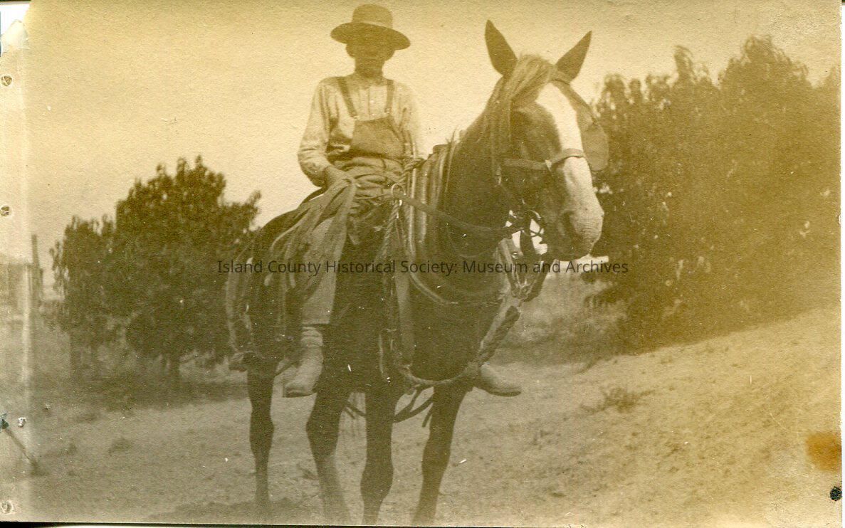 A photo of a man sitting on a horse. The man is wearing overalls and a hat. He has a rope in one hand.