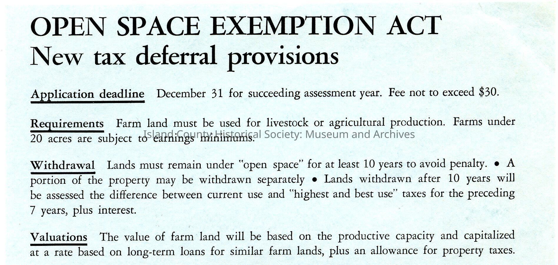 Small blue card with printed text on both sides. "Open Space Exemption Act" requirements for applying and how to apply.